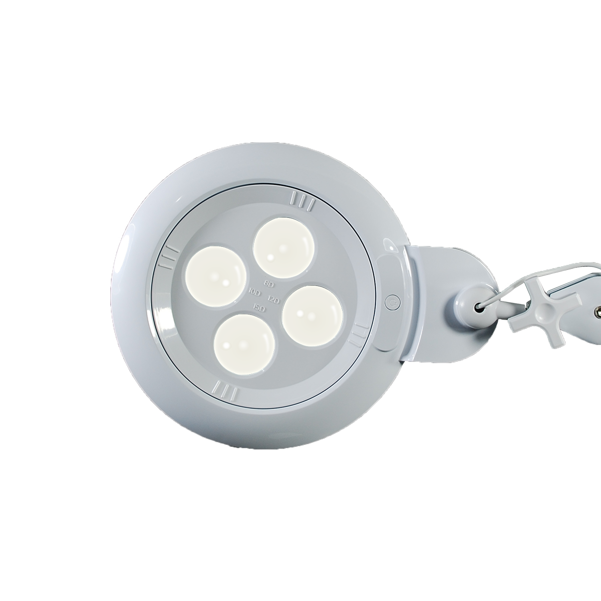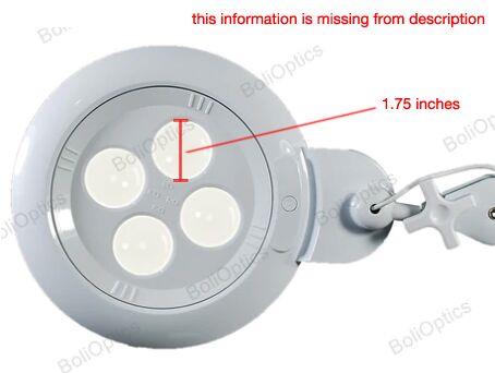 Flexible Arm. Total Arm Length: 863.6mm 34 inches. Illumination Type: SMD LED. Light Adjustable. Input Voltage: AC 100-240V 50/60Hz. Optical Lens Diopter: 8/10/12/15 Diopter (3/3.5/4/4.7X). Lens Size: Dia. 150mm (6 in. ).