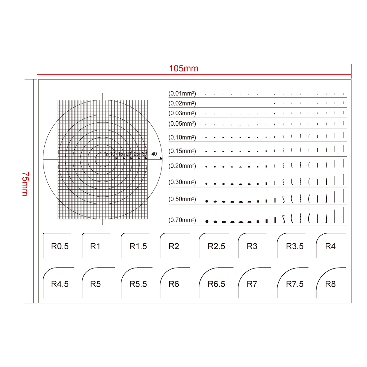 Multi-Function Film Ruler . Film Ruler Dimensions: 105x75x0.1mm. Diameters Range: Dia. 10-40mm. Area Measurement Type: 17 Species. Area Measurement Range: 0.01-0.70mm². R0.5-8mm.