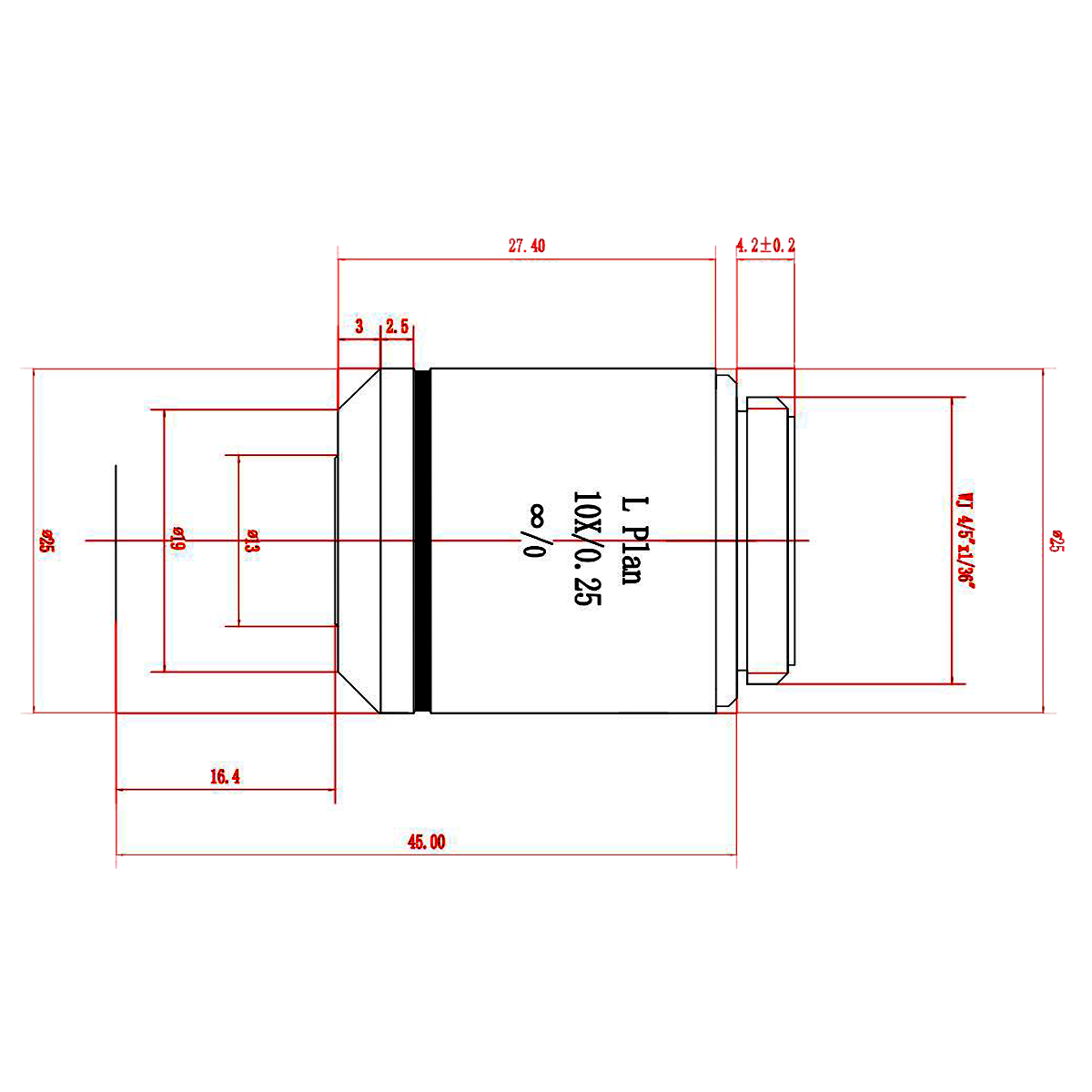 Infinite. 10X. Plan Achromatic Objective. Objective Parfocal Distance: 45mm. Objective for Focal Length: 200mm. Objective Working Distance: 17.7mm. N.A. 0.25.