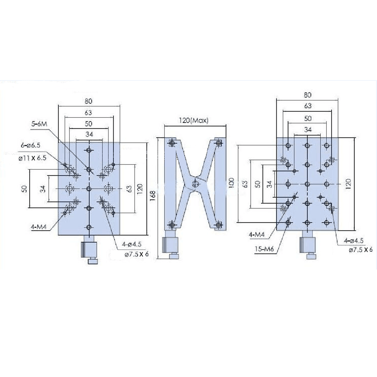 Mounting Holes Position: 25x25mm. M6. Stage Z Travel Distance: 6cm. Stage Platform Dimensions: 120x80mm. Stage Height: 6.2-12.2cm.